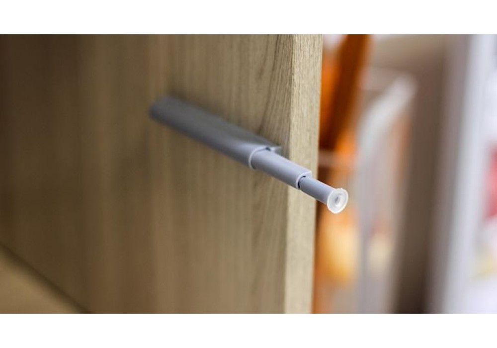 Внизу имеется четыре вместительных выдвижных ящика (комплектуются роликовыми направляющими) и два больших отделения вверху (комплектуются газлифтами) В каждой боковой секции по пять полок. Все дверцы, кроме верхних, оснащены толкателями.