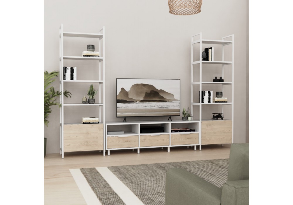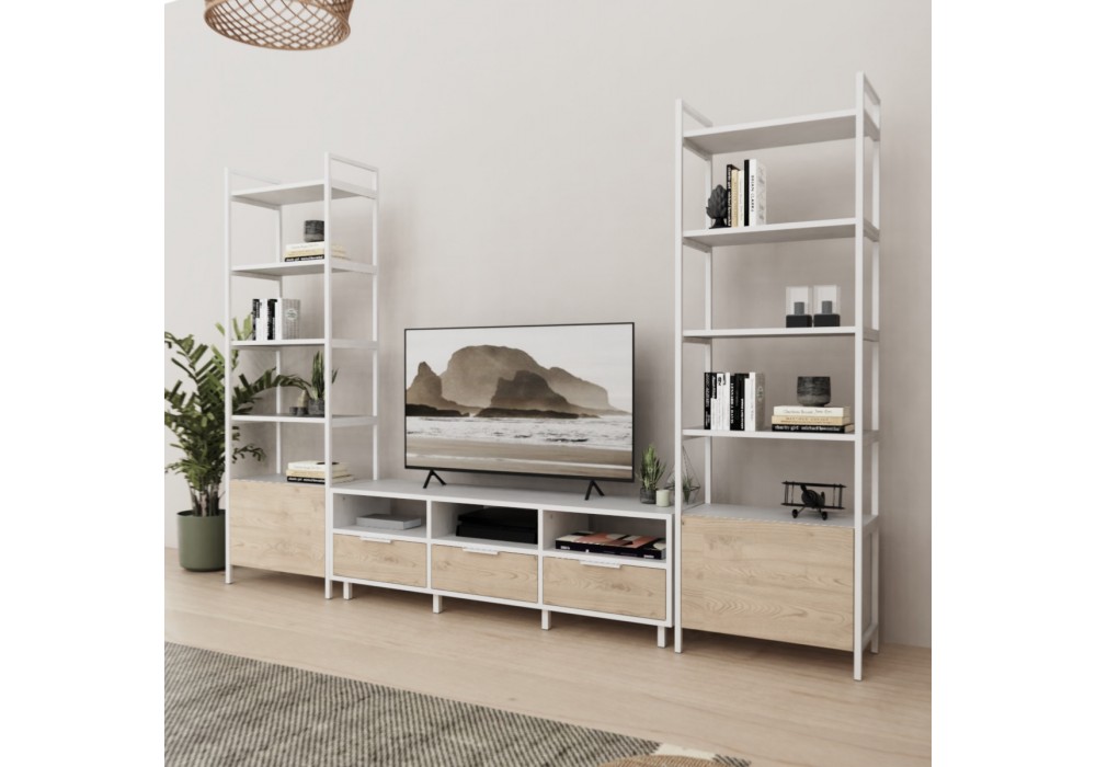Комплект состоит из двух стеллажей с шестью полками и тумбы под ТВ в стиле лофт с тремя выдвижными ящиками и полками. Стенка гармонично дополнит любой интерьер гостинной не нагружая пространство комнаты. Полки и тумба цвета Графит в сочетании с каркасом, ножками и ручками из металла цвета Латте смотрятся свежо и приятно.
