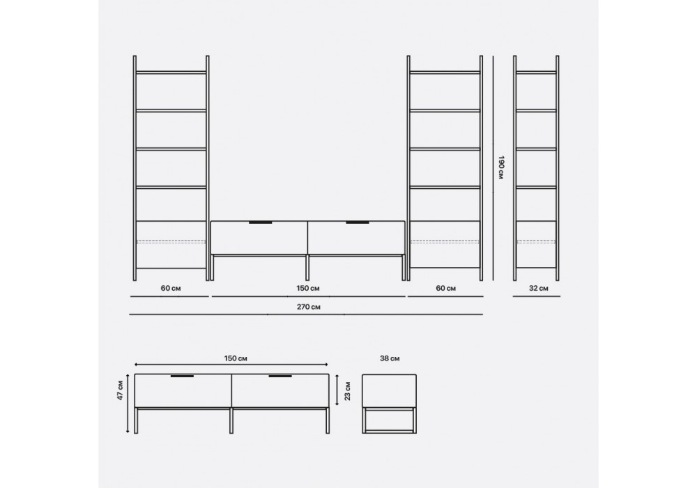 Комплект состоит из двух стеллажей и тумбы под ТВ в стиле лофт с двумя выдвижными ящиками. Стенка гармонично дополнит любой интерьер гостинной не нагружая пространство комнаты.