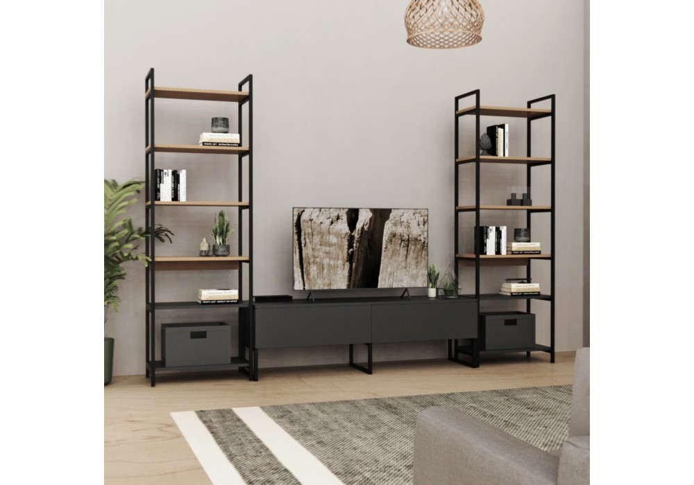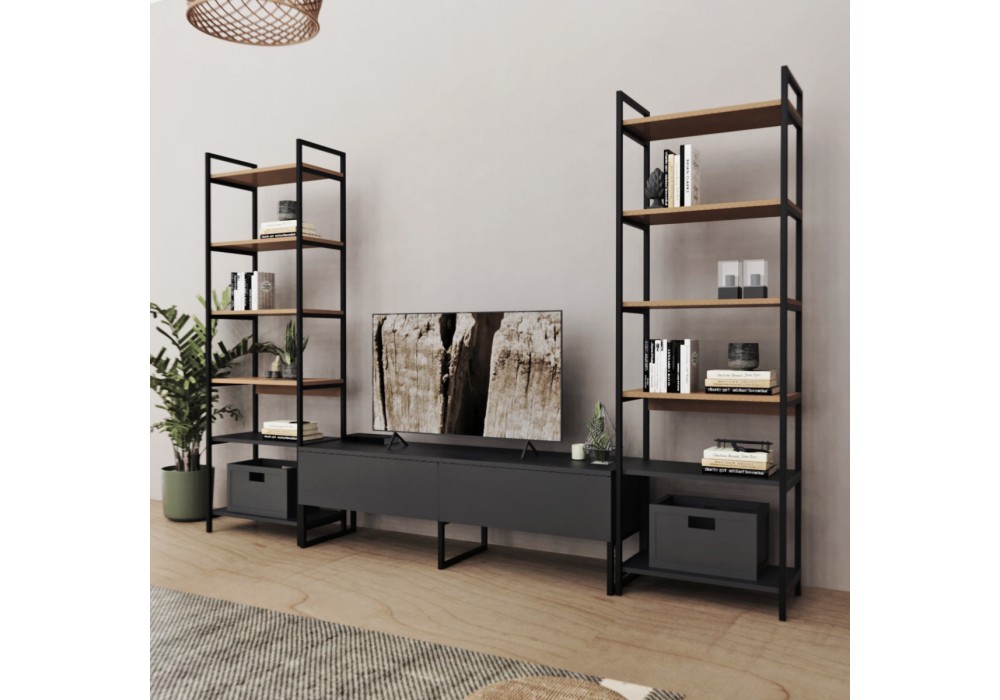 Комплект состоит из двух стеллажей и тумбы под ТВ в стиле лофт с двумя выдвижными ящиками. Стенка гармонично дополнит любой интерьер гостинной не нагружая пространство комнаты.