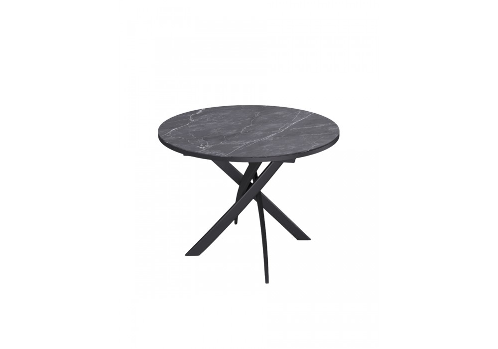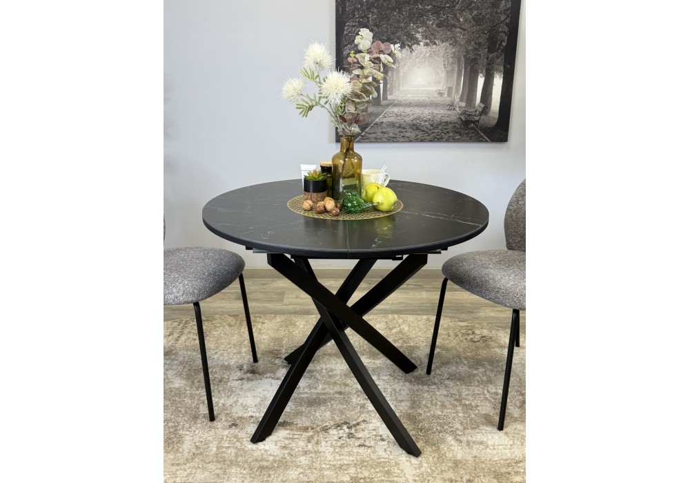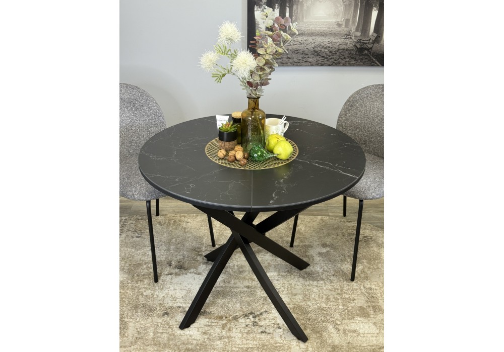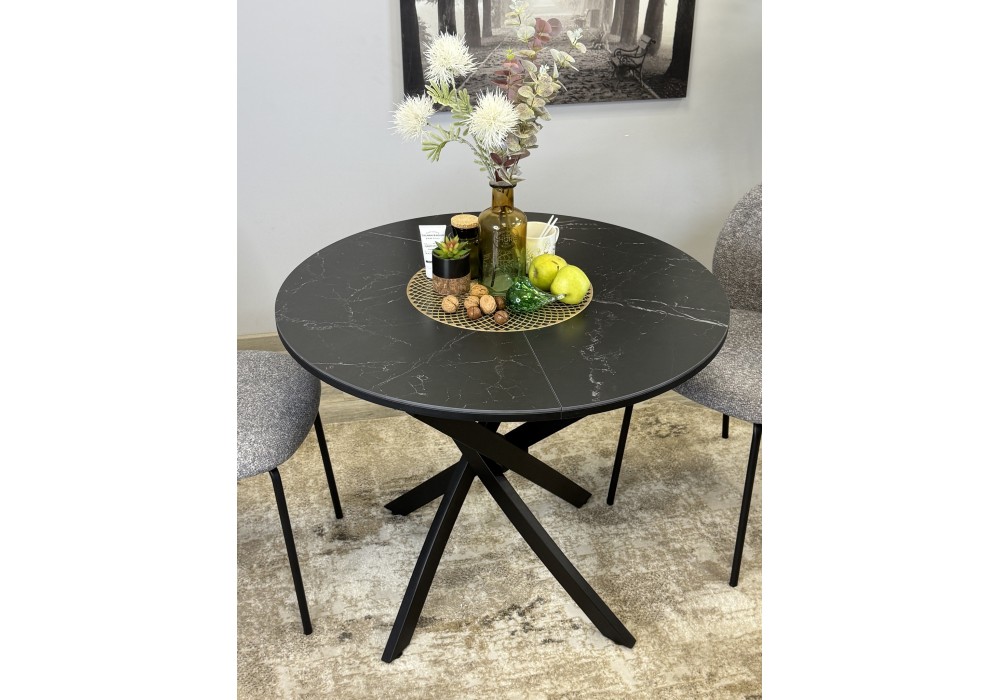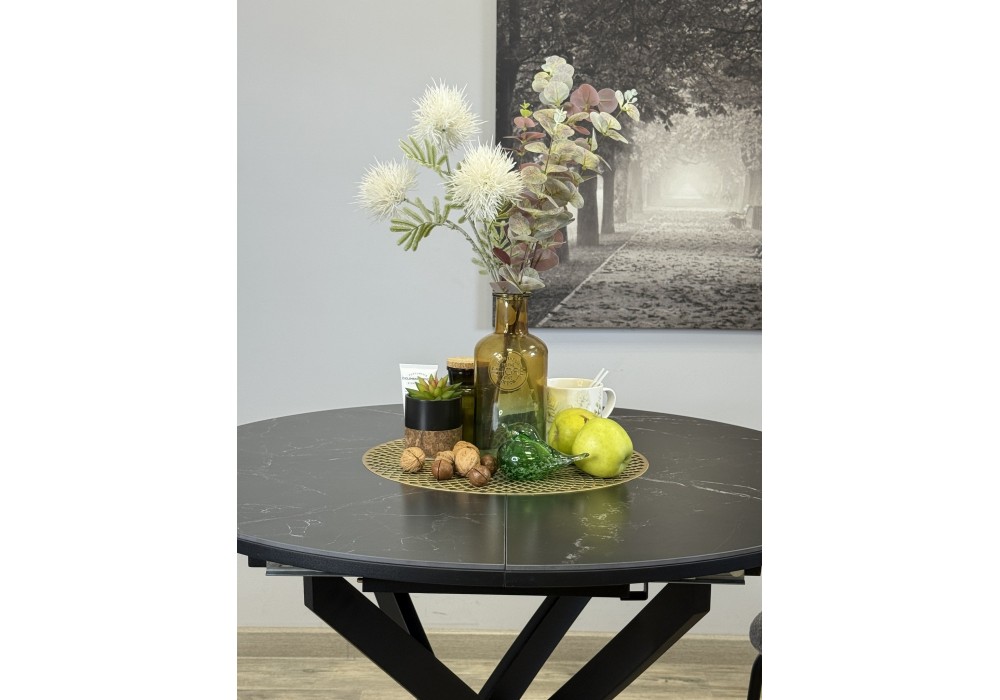 Ключевой особенностью этого стола является керамическая поверхность диаметром 90 см и долговечным, стабильным основанием. Дополняет комплект вставка на 30 см, расширяющая площадь стола.