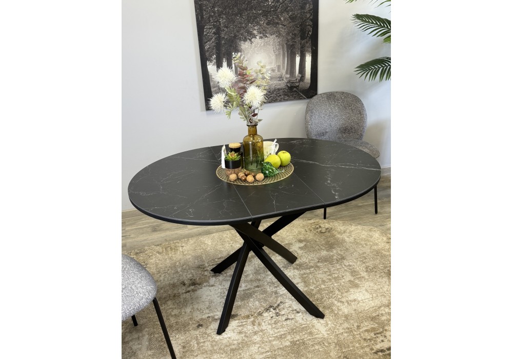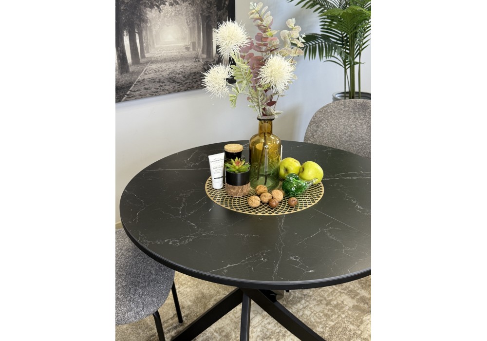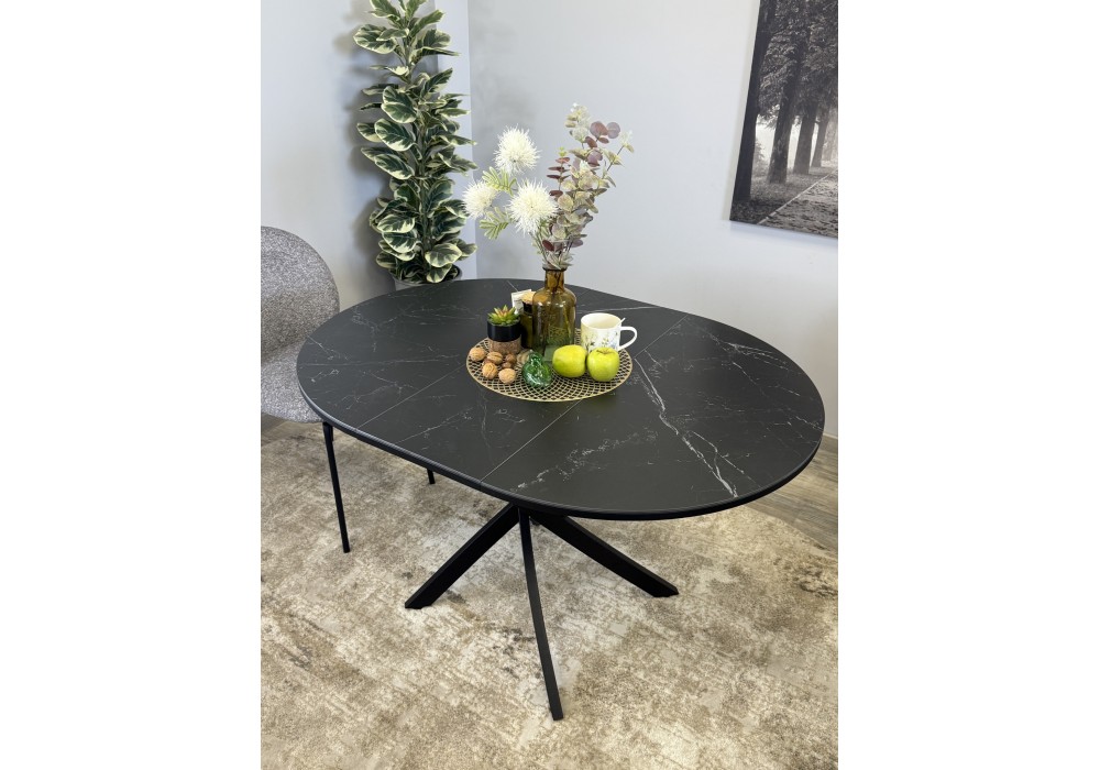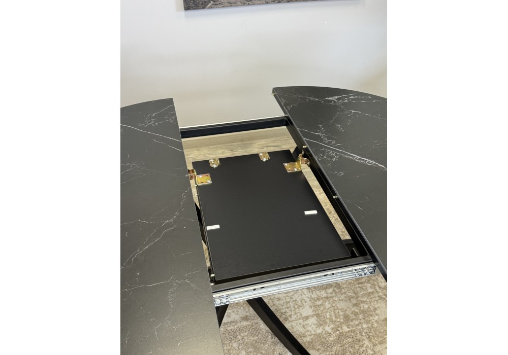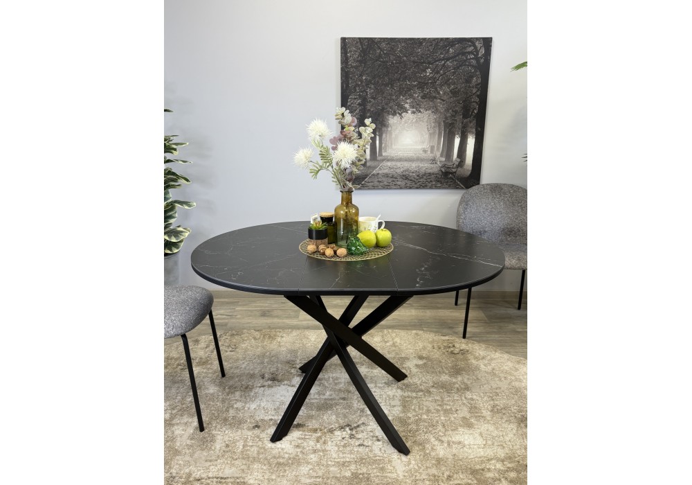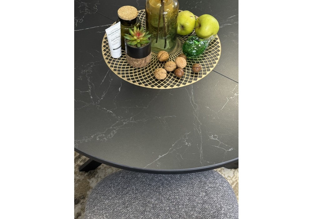 Ключевой особенностью этого стола является керамическая поверхность диаметром 90 см и долговечным, стабильным основанием. Дополняет комплект вставка на 30 см, расширяющая площадь стола.