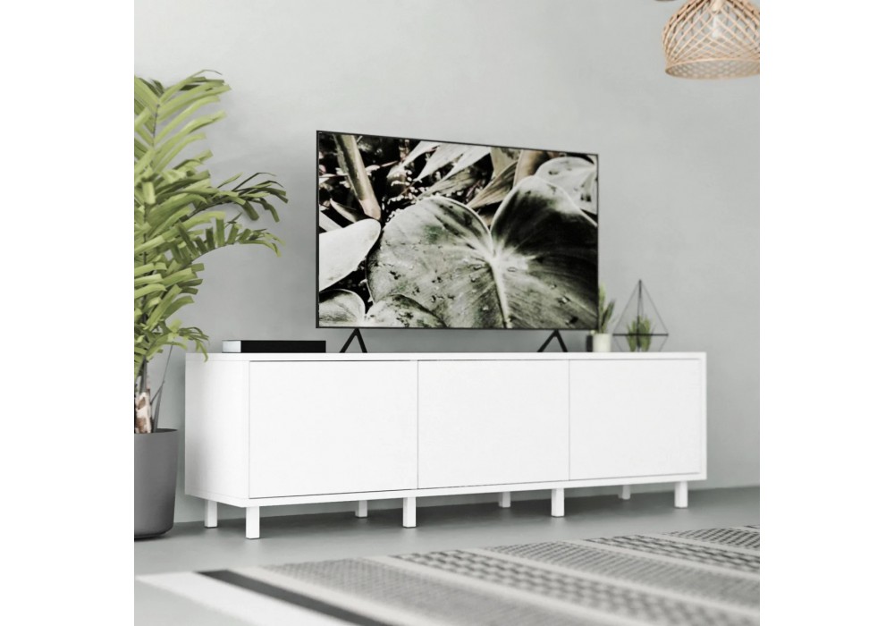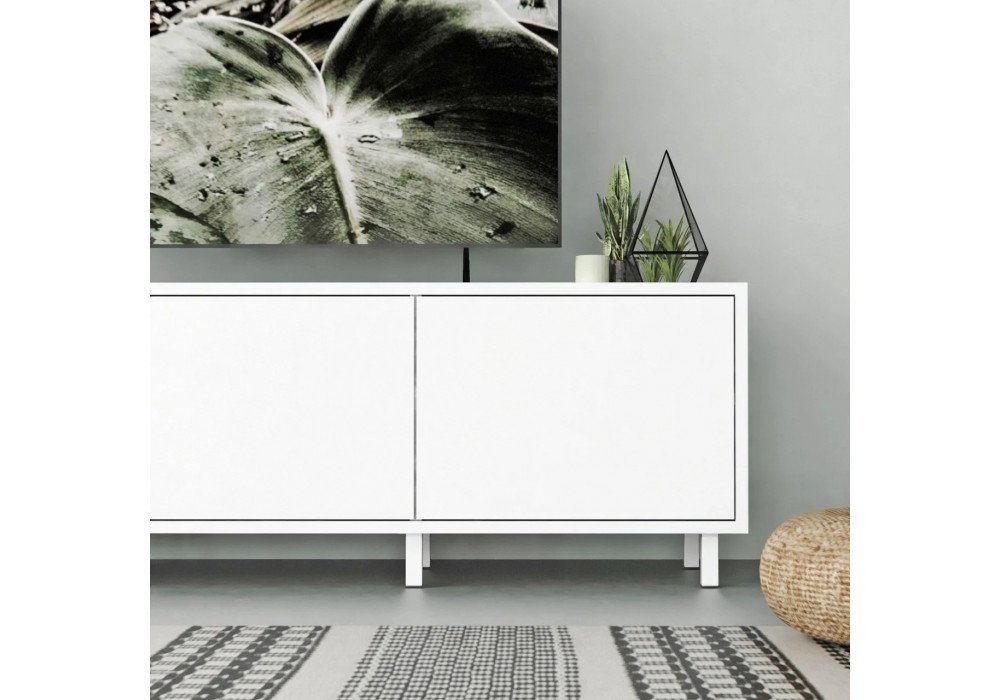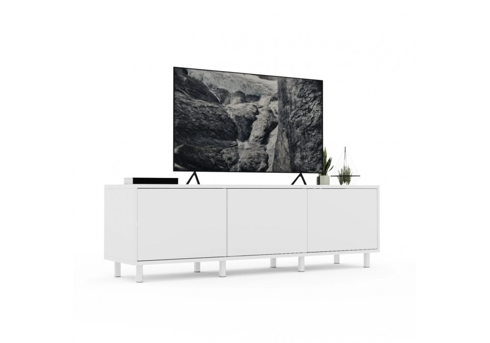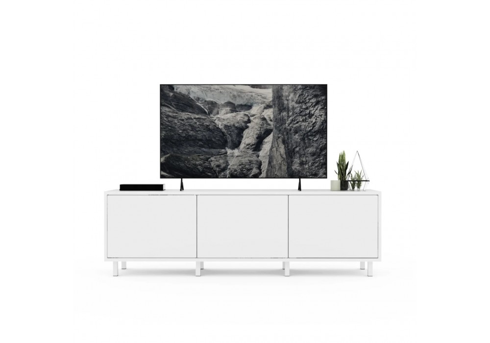 Металлические ножки покрыты прочной полимерной краской, а еще она не выделяет вредных веществ. Три открывающиеся дверки с технологией открытия при нажатии PUSH-TO-OPEN. Внутри пространство делит полка. Отверстие для проводов на задней стенке тумбы.