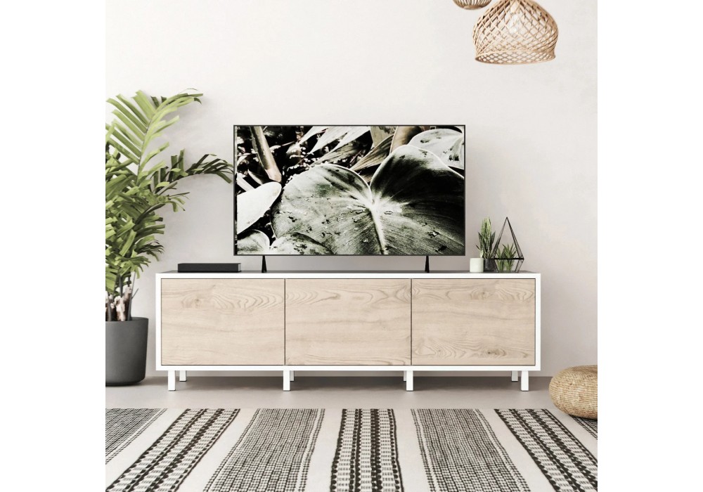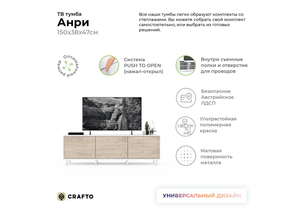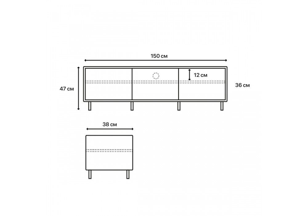 Металлические ножки покрыты прочной полимерной краской, а еще она не выделяет вредных веществ. Три открывающиеся дверки с технологией открытия при нажатии PUSH-TO-OPEN. Внутри пространство делит полка. Отверстие для проводов на задней стенке тумбы.