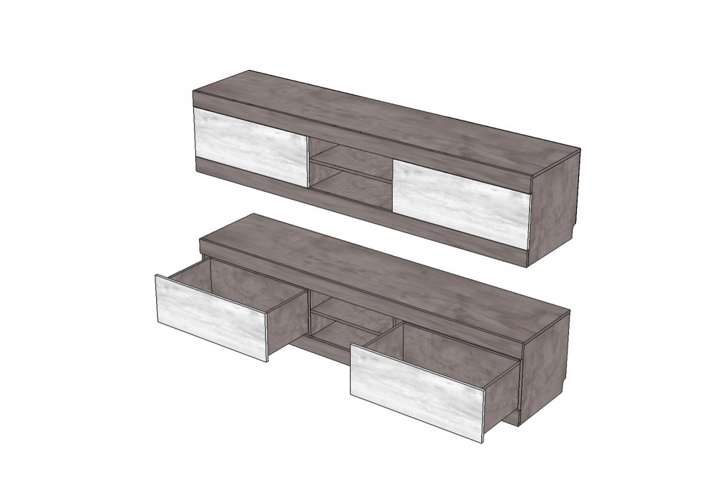 Детали тумбы, которые в эксплуатации подвержены механическим повреждениям, облицованы кромкой ПВХ толщиной 2 мм. Задняя стенка изготовлена из ХДФ. В тумбе установлены два выдвижных ящика на шариковых направляющих. Для удобства открывания накладки ящиков изготовлены больше корпуса со свесом. Тумба комплектуется ручками, при желании можно самостоятельно установить их.