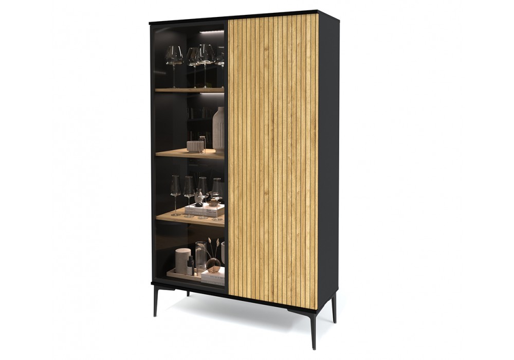 1. Корпус:- ЛДСП 16 мм Черный; оклеивается кромкой: черной 0,45 мм;- Внутренние полки ЛДСП 16 мм Дуб Золотой, оклеиваются кромкой: дуб золотой 0,45 мм.2. Фасад:- ЛДСП 18 мм Дуб Гринвич 705 WML, оклеивается кромкой: дуб золотой 1 мм;- Дверь рамочная Z1 (черная) со стеклом графит.3. Фурнитура:- Петли накладные без доводчика;- Механизм Push-to-open усиленный (черный);- Опора Windsor H-180 (черная).