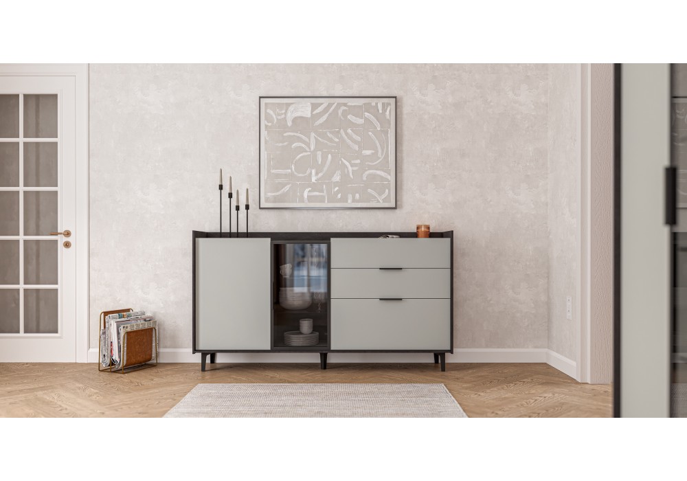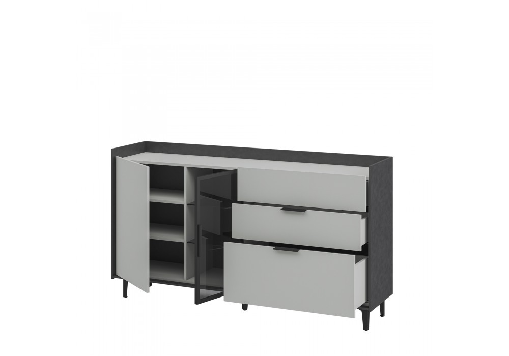 Тумба с тремя выдвижными ящиками; одной глухой распашной дверью и одной распашной витриной из алюминиевой рамки профилем 20х20мм, цвет: чёрный брашированный с тонированным стеклом