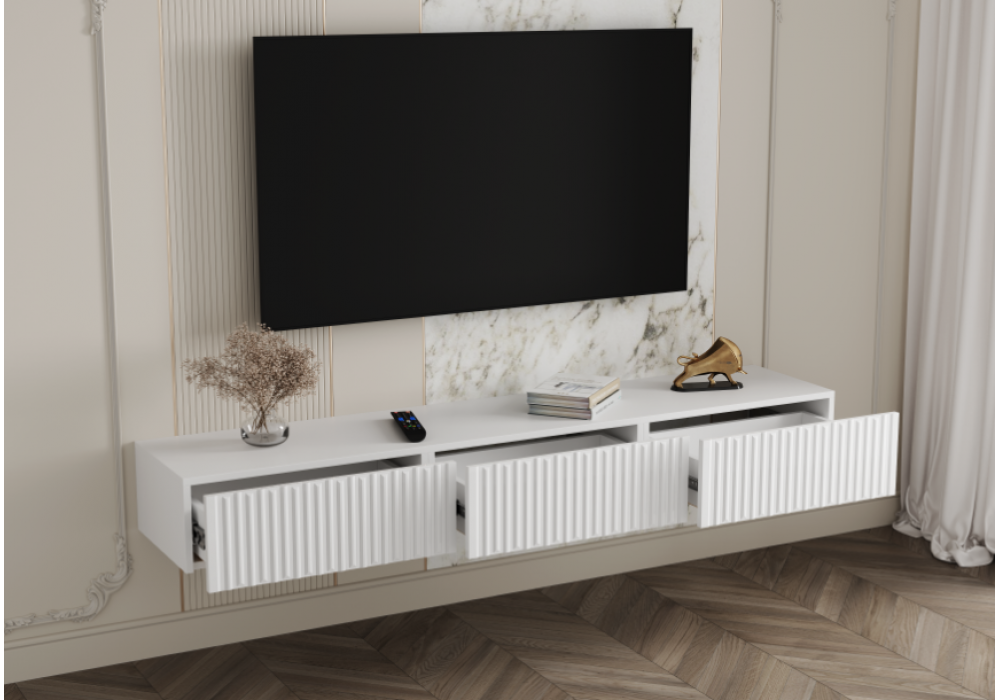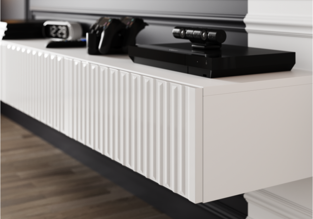 Тумба ТВ Сопрано - это стильный и функциональный элемент мебели в неоклассическом стиле. Внутреннее пространство тумбы разделено на три части в каждой из которых расоложен ящик на шариковых направляющих полного выдвижения. Ящики открываются через захват снизу: между корпусом и фасадами предусмотрен зазор, что обеспечивает легкость выдвижения. Декоративная фрезеровка на фасадах ящиков добавит пространству элегантности, а белый цвет изделия визуально расширит пространство. Максимально допустимая нагрузка в 30 кг позволяет использовать тумбу для хранения различных предметов.